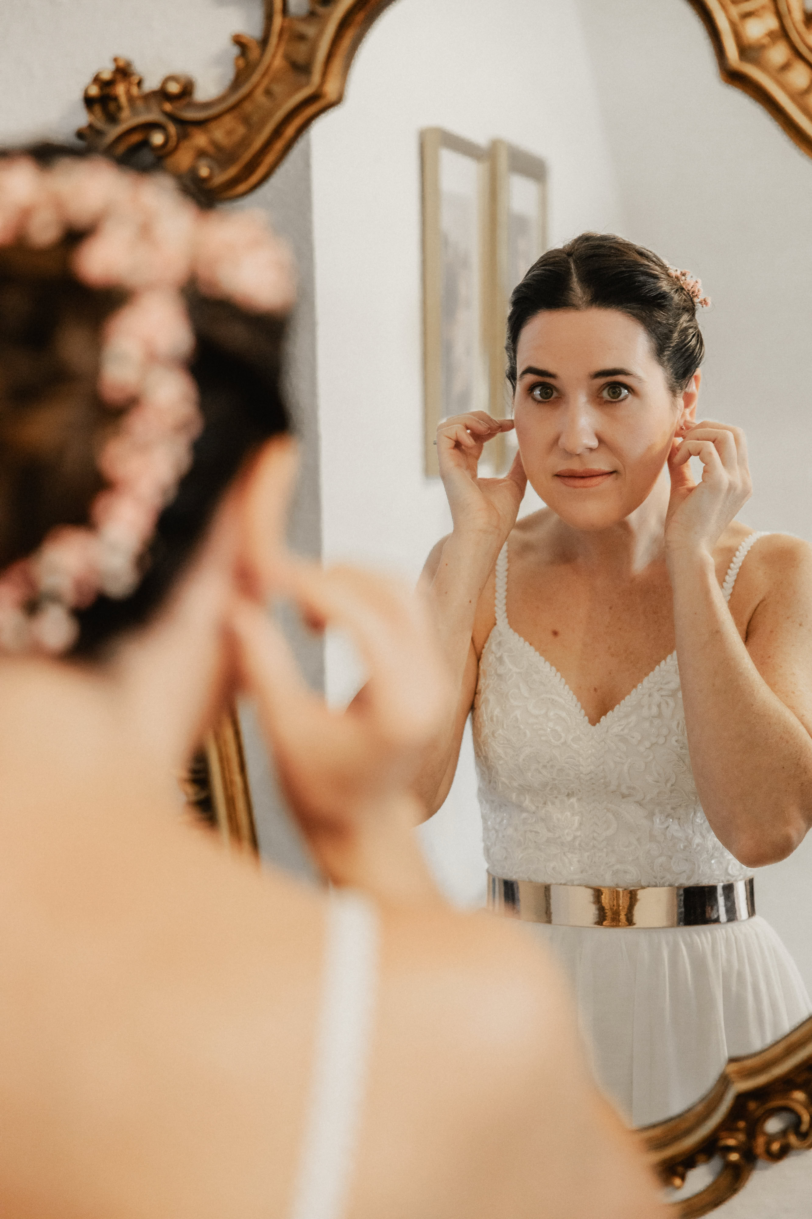 Ich durfte Katharina bei ihrem Getting-Ready begleiten, als sie sich auf ihren großen Tag vorbereitete. Es war eine emotionale Zeit, als ihre Familie sie unterstützte und ihre beste Freundin Beatrice ihr in ihr traumhaftes Brautkleid half. Ich konnte die freudige Aufregung förmlich spüren, als Katharina die Treppe hinab schritt und alle im Hausflur auf sie warteten, um den ersten Blick auf die strahlende Braut zu erhaschen.