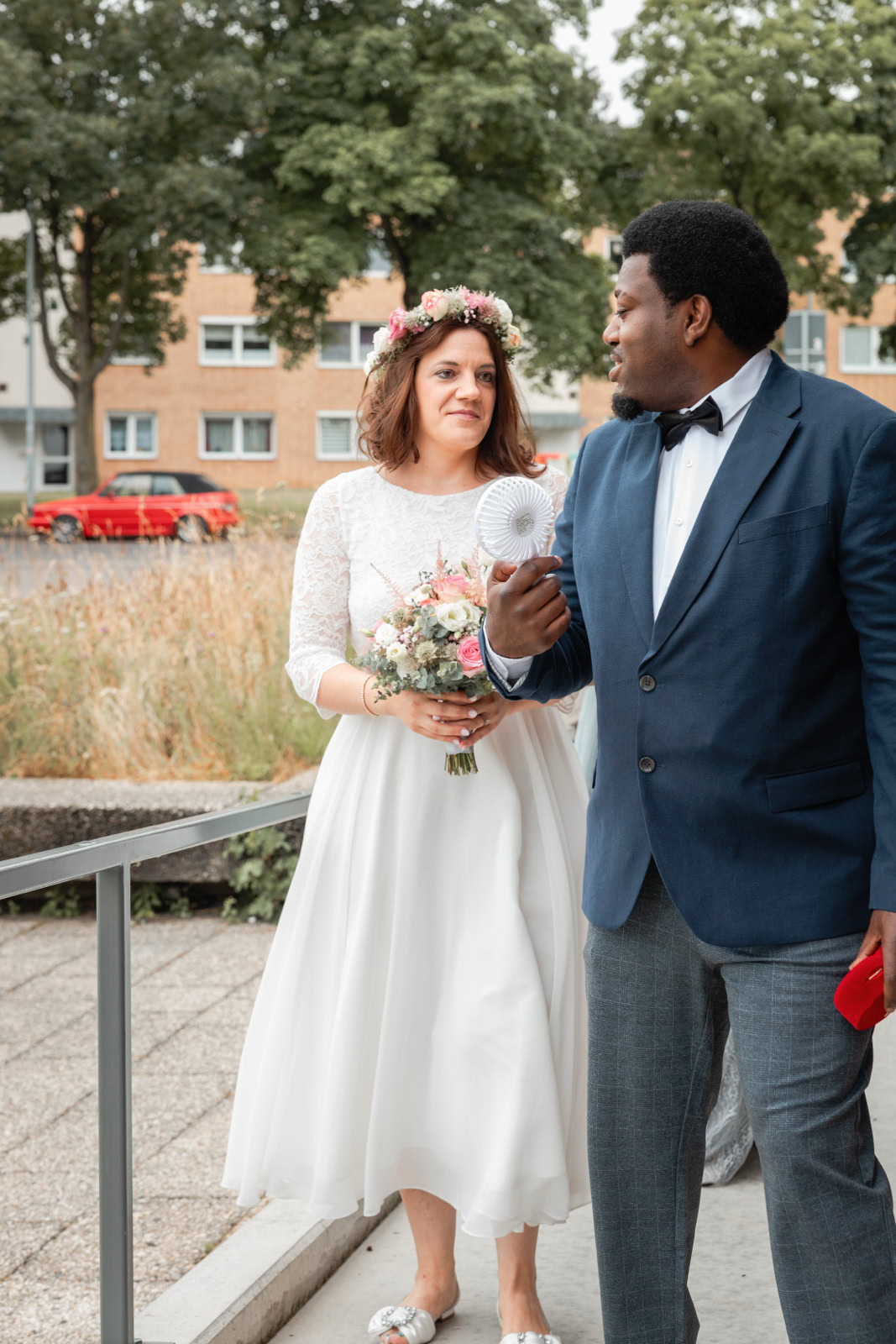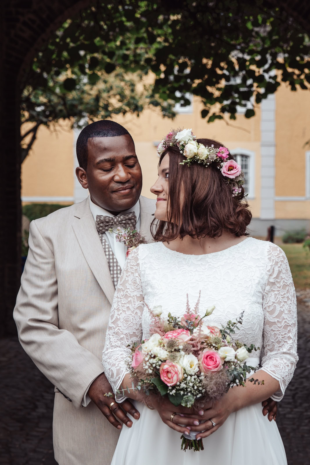 Nach der emotionalen Zeremonie begaben wir uns zum Brautpaarshooting in den historischen Ortskern Alt-Kaster, wo die romantische Kulisse dafür sorgte, dass Michele und Dombel trotz anfänglicher Schüchternheit vor der Kamera immer mehr auftauten. Mit sanften Anleitungen gelang es mir, ihre Natürlichkeit und innige Verbundenheit festzuhalten, was sich auch in den bezaubernden Fotos widerspiegelte.