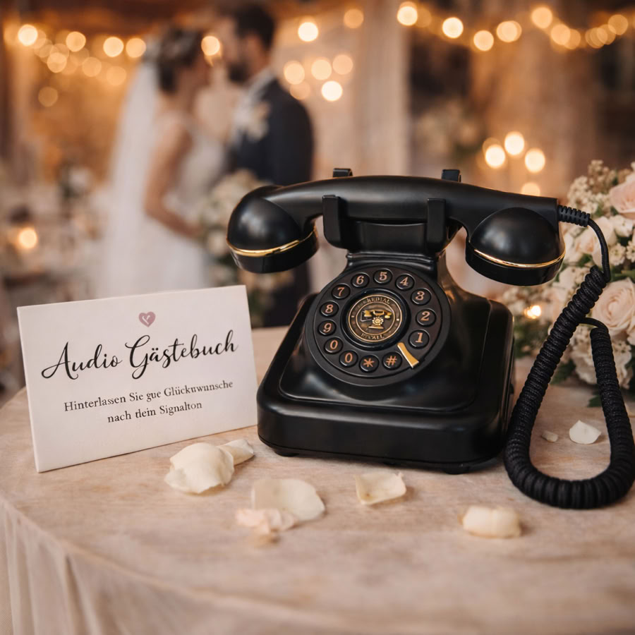 Das Audio-Gästebuch ist eine Bereicherung für deine Feier. Verleihe deiner Hochzeit eine persönliche und besondere Note. Unser Audio-Gästebuch fängt die echten Emotionen deiner Gäste ein und ist damit viel persönlicher als ein klassisches Gästebuch. Deine Gäste hören eine persönliche Begrüßungsnachricht von dir und können im Anschluss ihre Nachricht aufnehmen. Das Wiederhören der Aufnahmen Jahre später ist ein tief bewegendes Erlebnis, dass die Erinnerungen an den Tag auf eine einzigartige Weise lebendig hält.