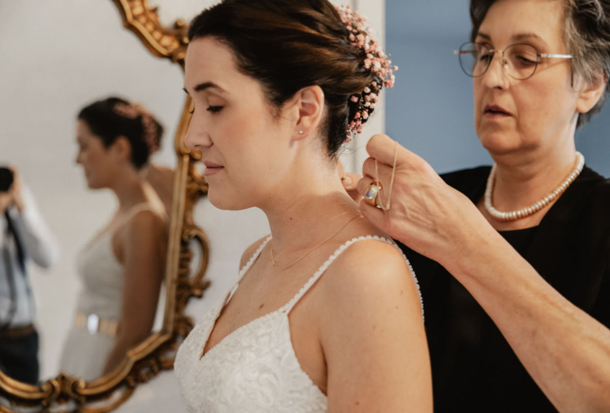 Ich durfte Katharina bei ihrem Getting-Ready begleiten, als sie sich auf ihren großen Tag vorbereitete. Es war eine emotionale Zeit, als ihre Familie sie unterstützte und ihre beste Freundin Beatrice ihr in ihr traumhaftes Brautkleid half. Ich konnte die freudige Aufregung förmlich spüren, als Katharina die Treppe hinab schritt und alle im Hausflur auf sie warteten, um den ersten Blick auf die strahlende Braut zu erhaschen.